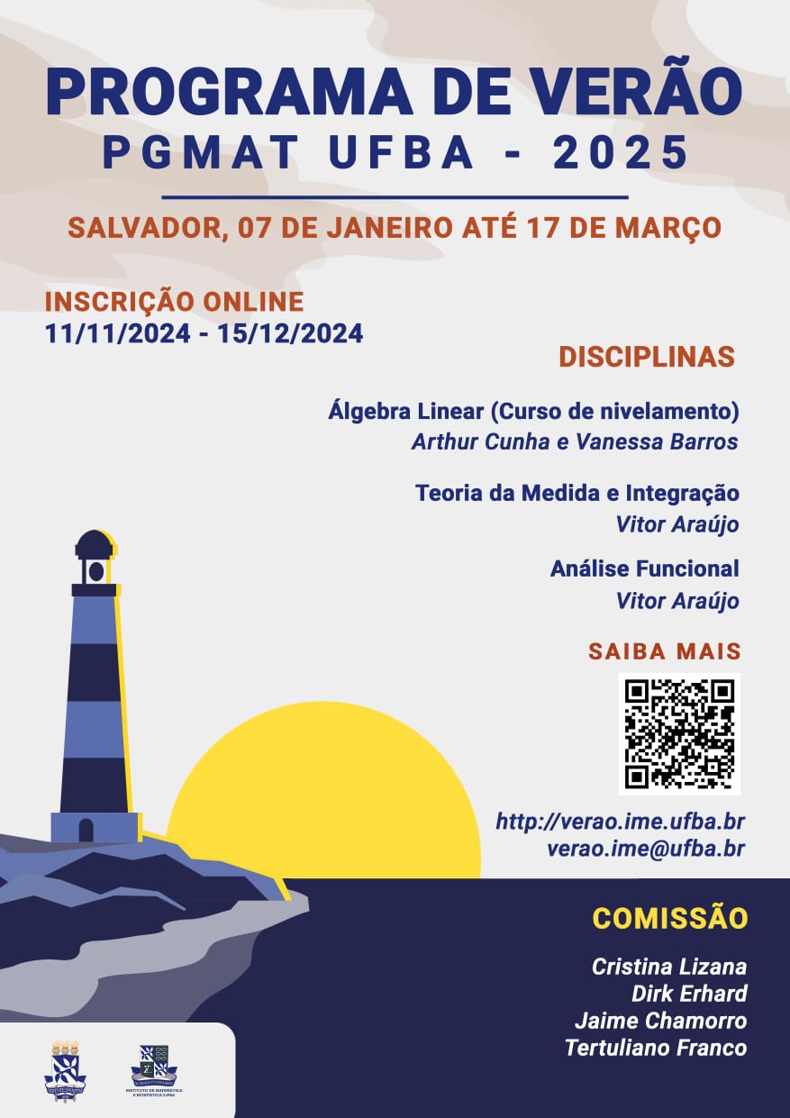 O Programa de Verão é oferecido pelo Instituto de Matemática e Estatística da Universidade Federal da Bahia há mais de 40 anos. A edição 2025 acontecerá de 06 de janeiro a 17 de março.